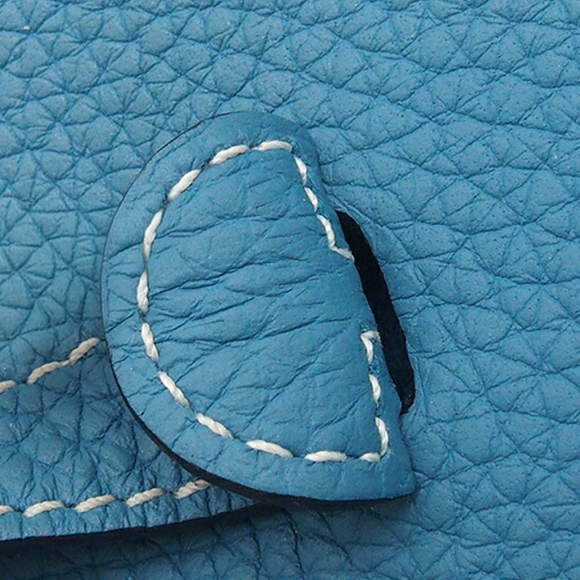 This Evelyne TPM features a Clemence leather body in New Blue Jean color, a detachable flat strap, and an open top with a strap and snap button closure.