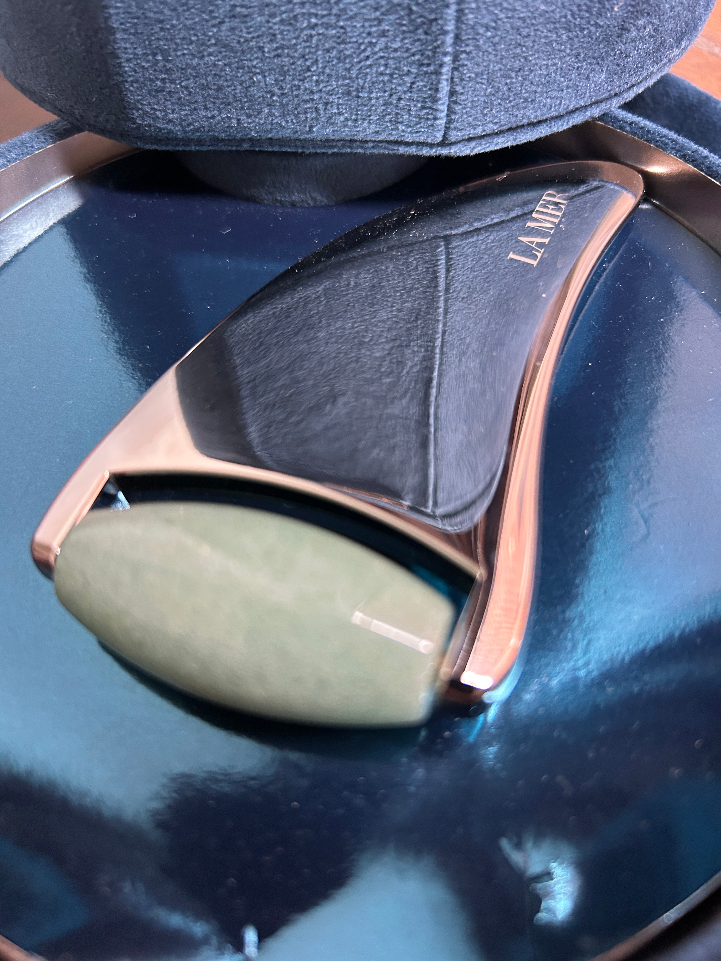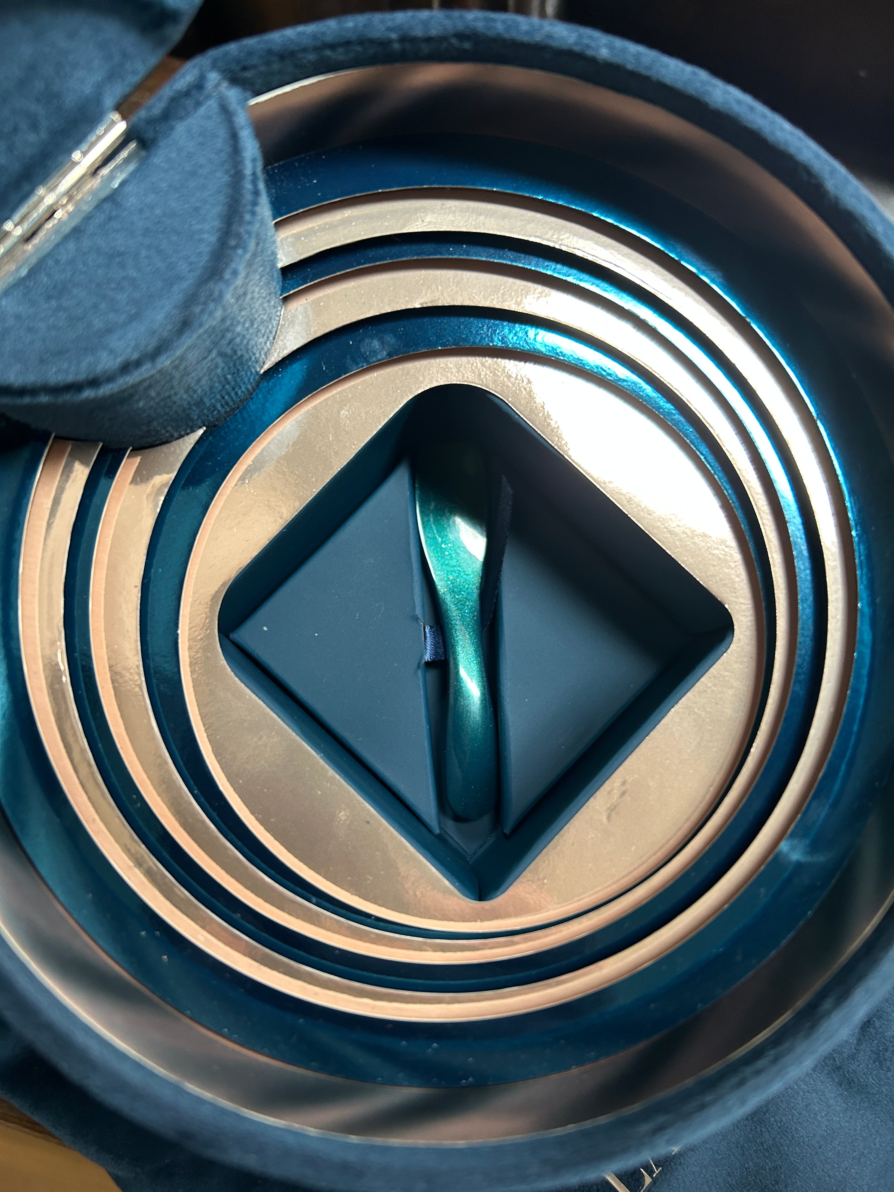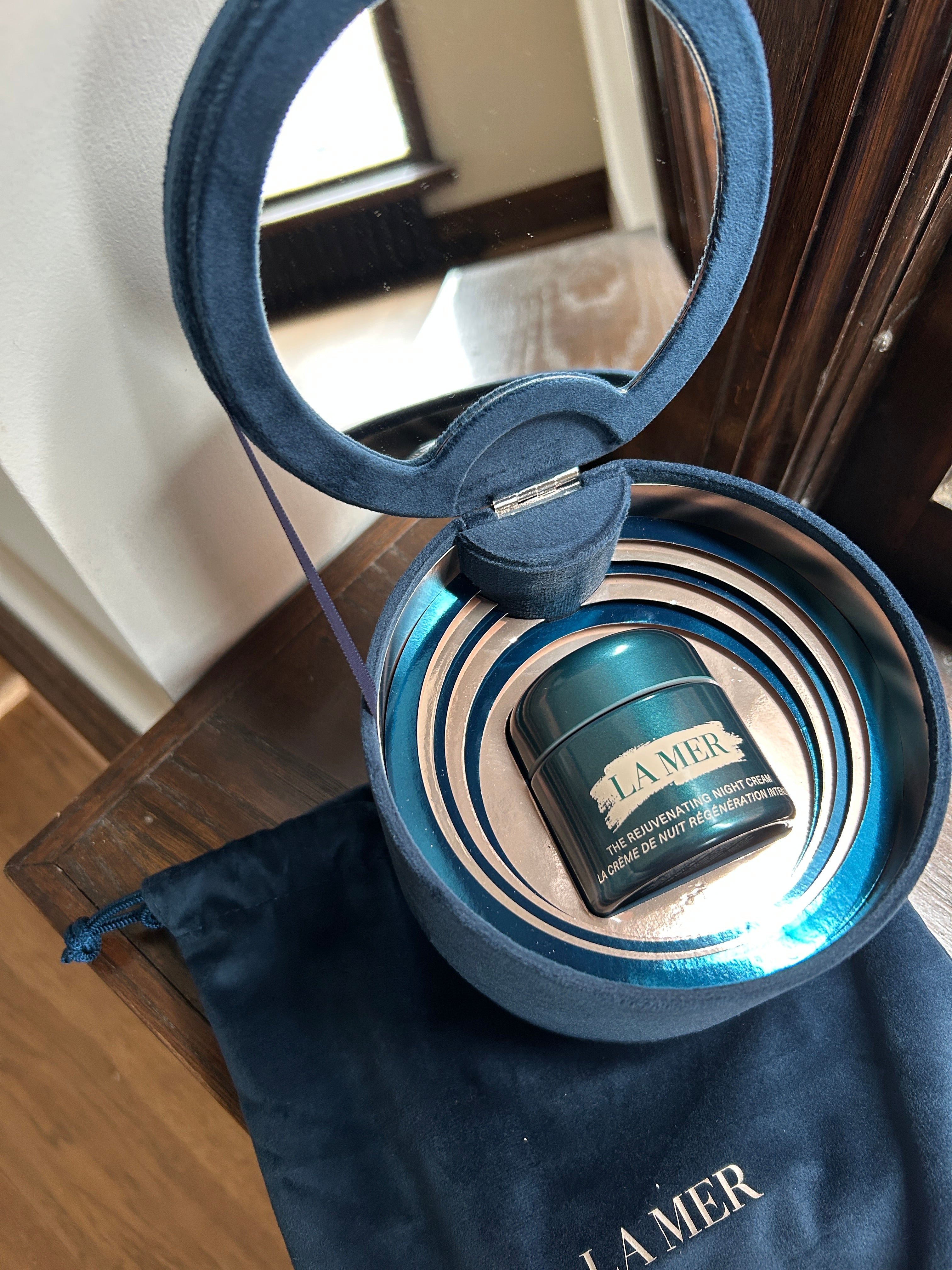 Teal velour bag, and coffret with mirror.