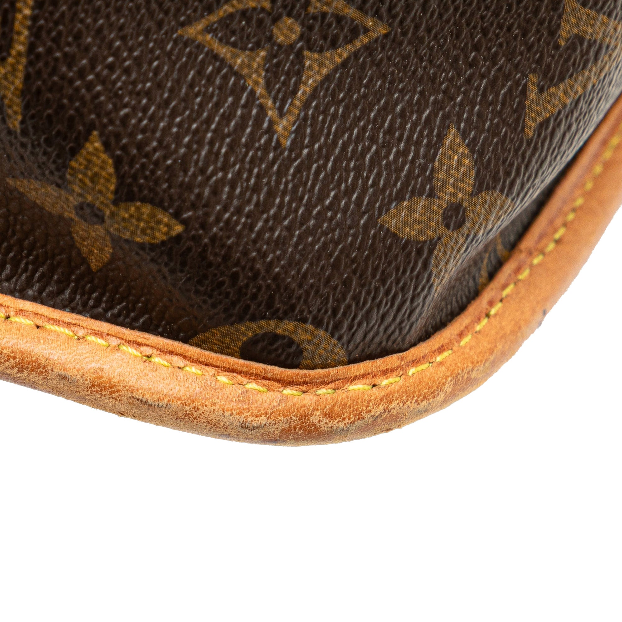 The Sologne features the Monogram canvas, an adjustable flat vachetta strap with a vachetta shoulder pad, vachetta trim, a front flap secured by a belt and buckle closure, exterior front and back pockets, and an interior pocket.