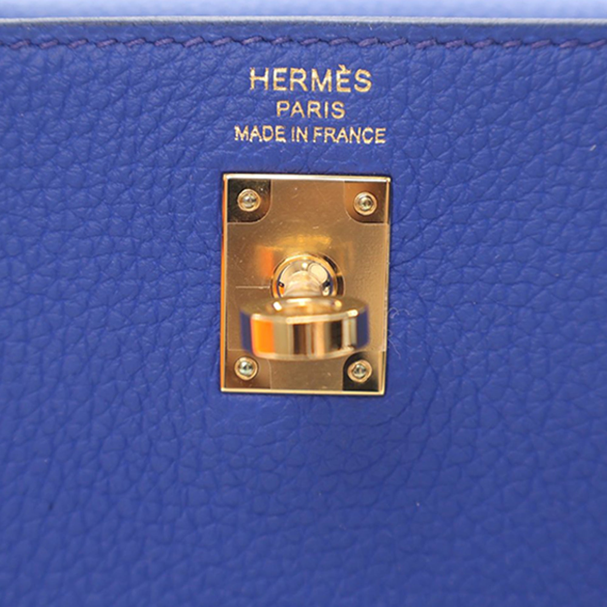 This Kelly 25 features a Togo leather body in Bleu Royal color, a flat leather top handle, a detachable flat leather strap, a front flap with twist lock closure, and interior zip and slip pockets.