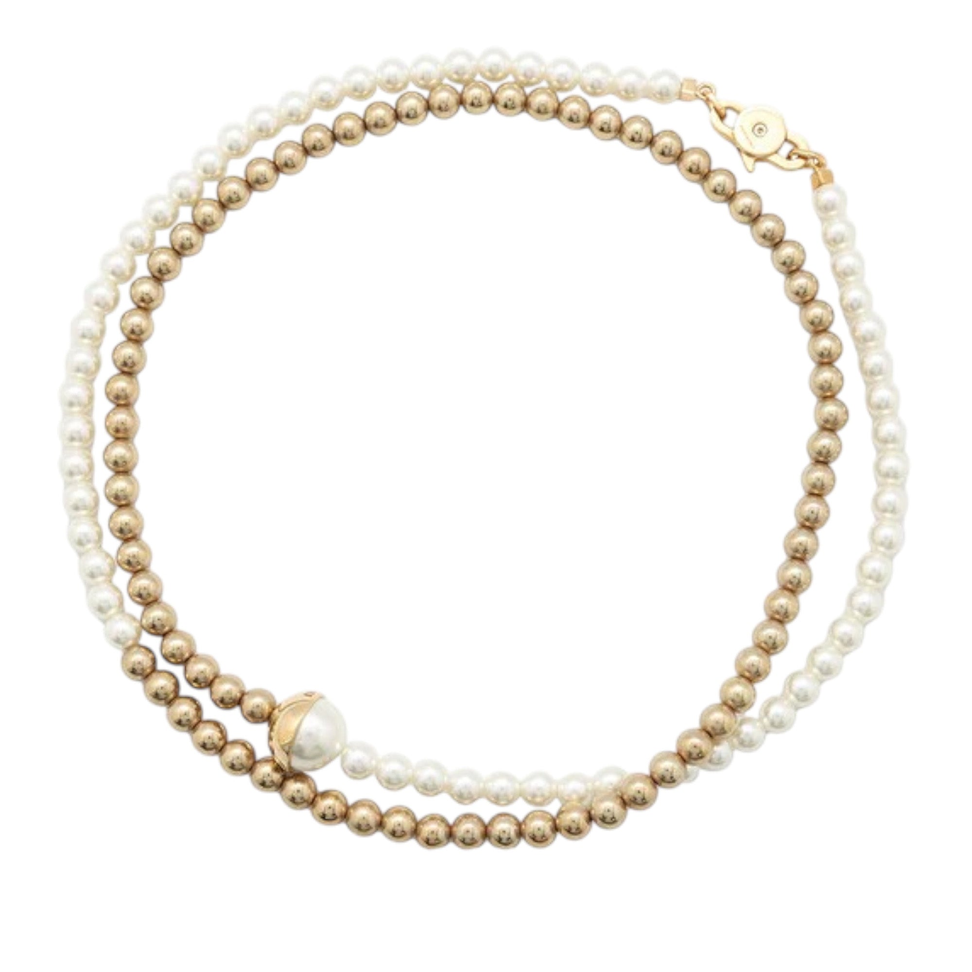 This necklace features gold plated and faux pearl beads body and a lobster clasp closure.