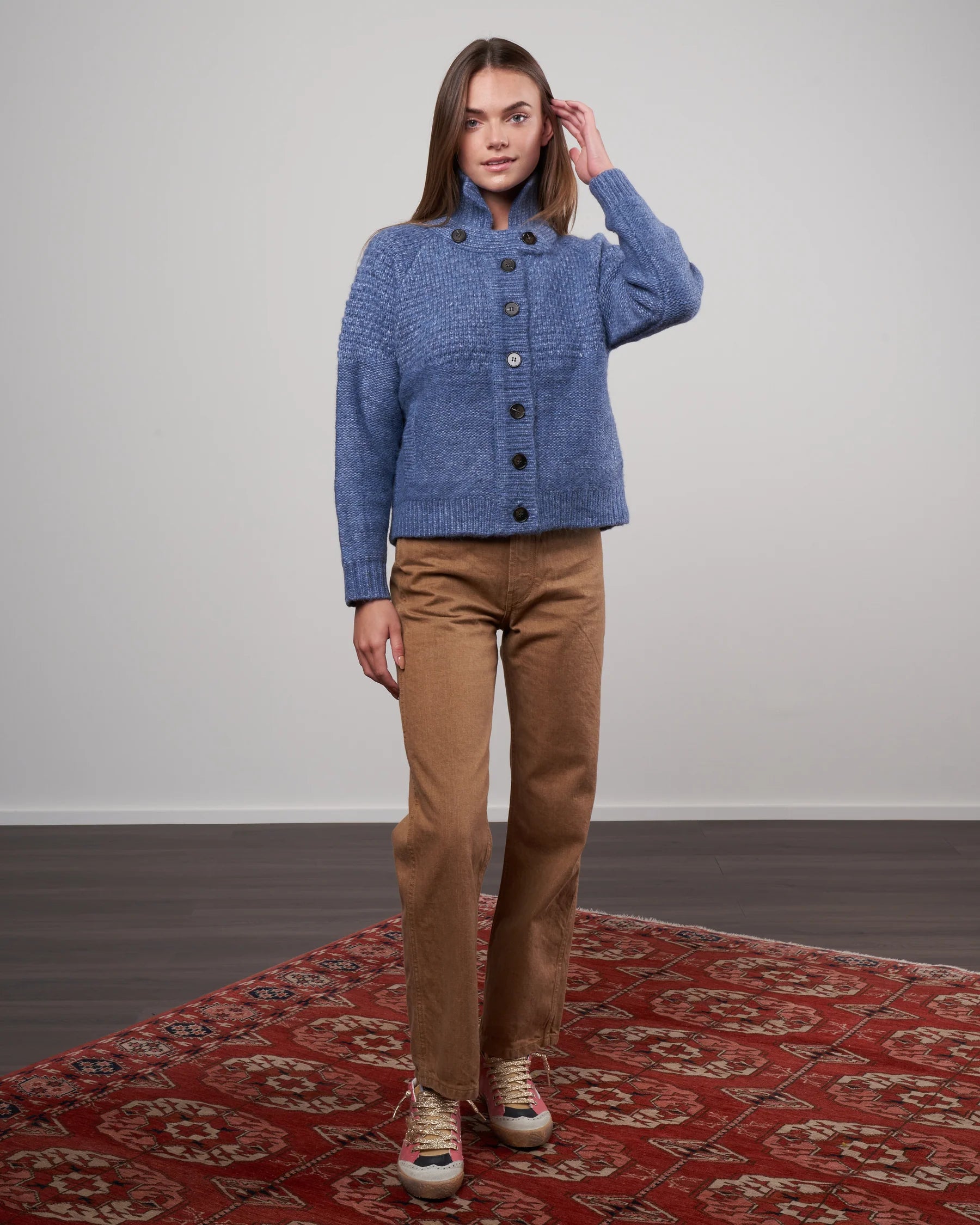 Description:   THE GREAT Shrunken Hearth Cardigan Sweater in Marled Saltwater Blue Yarn. This is a Mid-Weight, Mixed Stitch Sweater w/ Spread Collar and a Button Tab at the Neck That's Perfect For Colder Weather Everyday Wear.* Button Placket Front Closure* Spread Collar w/ Button Tab* Welt Pockets at Front Waist* Raglan Sleeves* Ribbed Knit Collar, Cuffs & Hem* * Hand Wash or Dry Clean